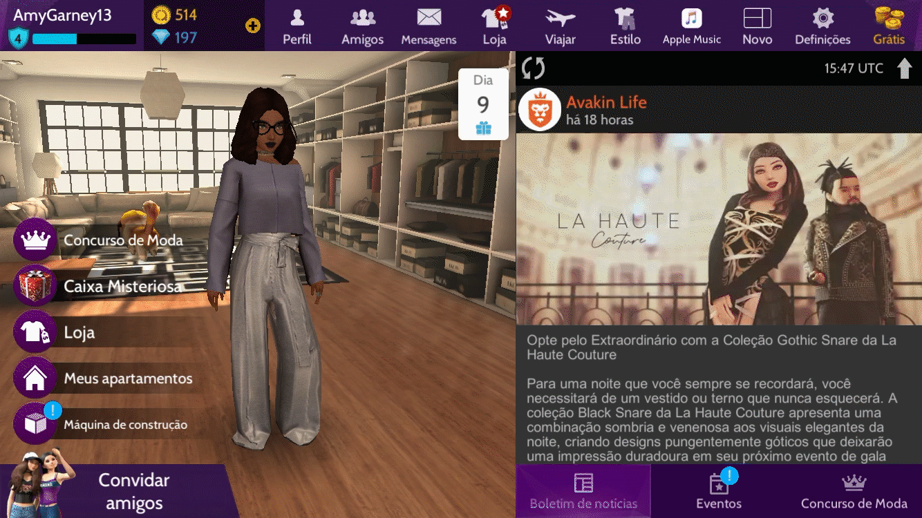 O Boletim de Notícias é o canal que te conecta aos mais novos lançamentos e atualizações de Avakin. Lá, você pode ver tudo o que está acontecendo no momento, como coleções de moda, concursos e parcerias.